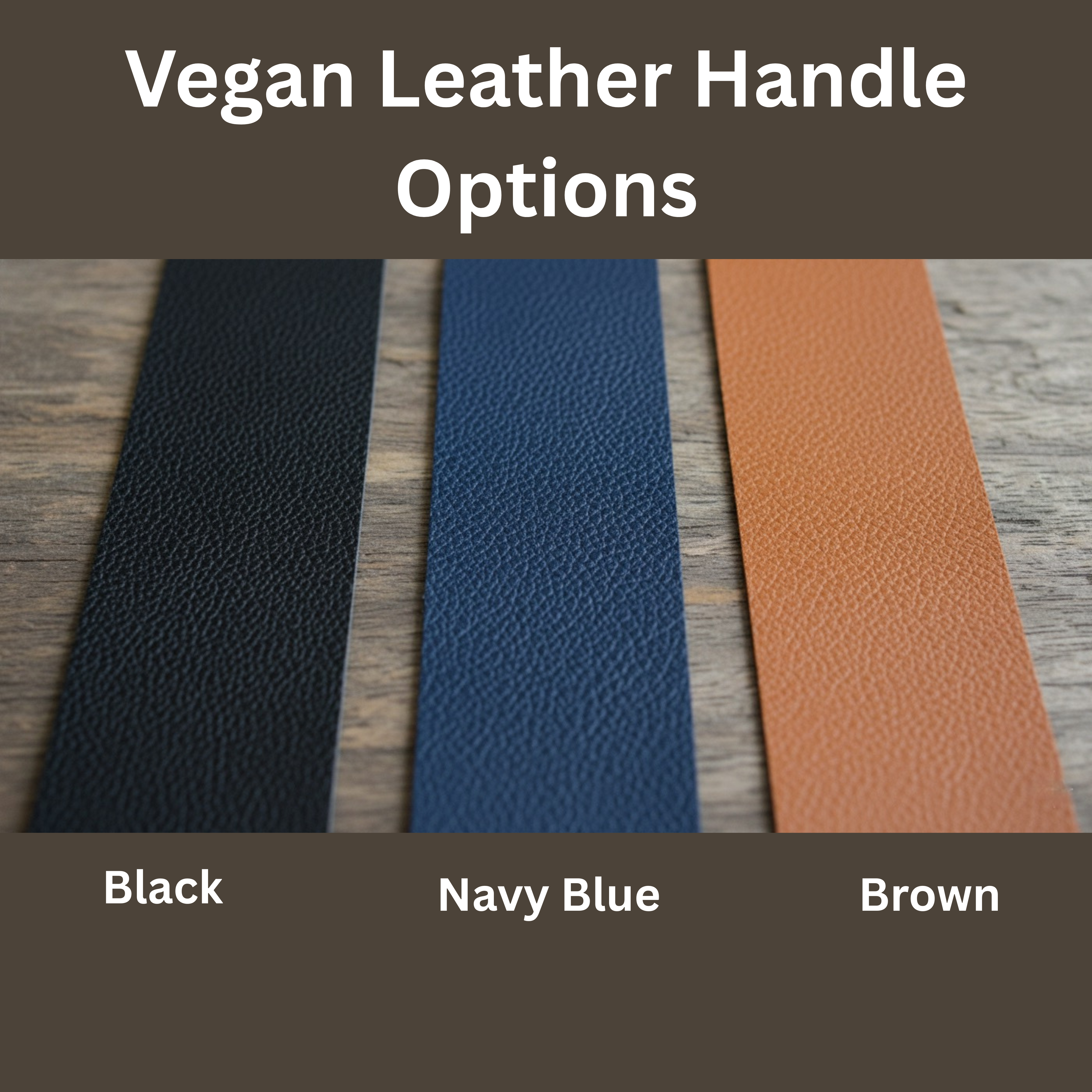 The bag handles can be ordered in your choice of Black, Navy Blue, or Brown vegan leather to suit your personal style and give a a custom feel.