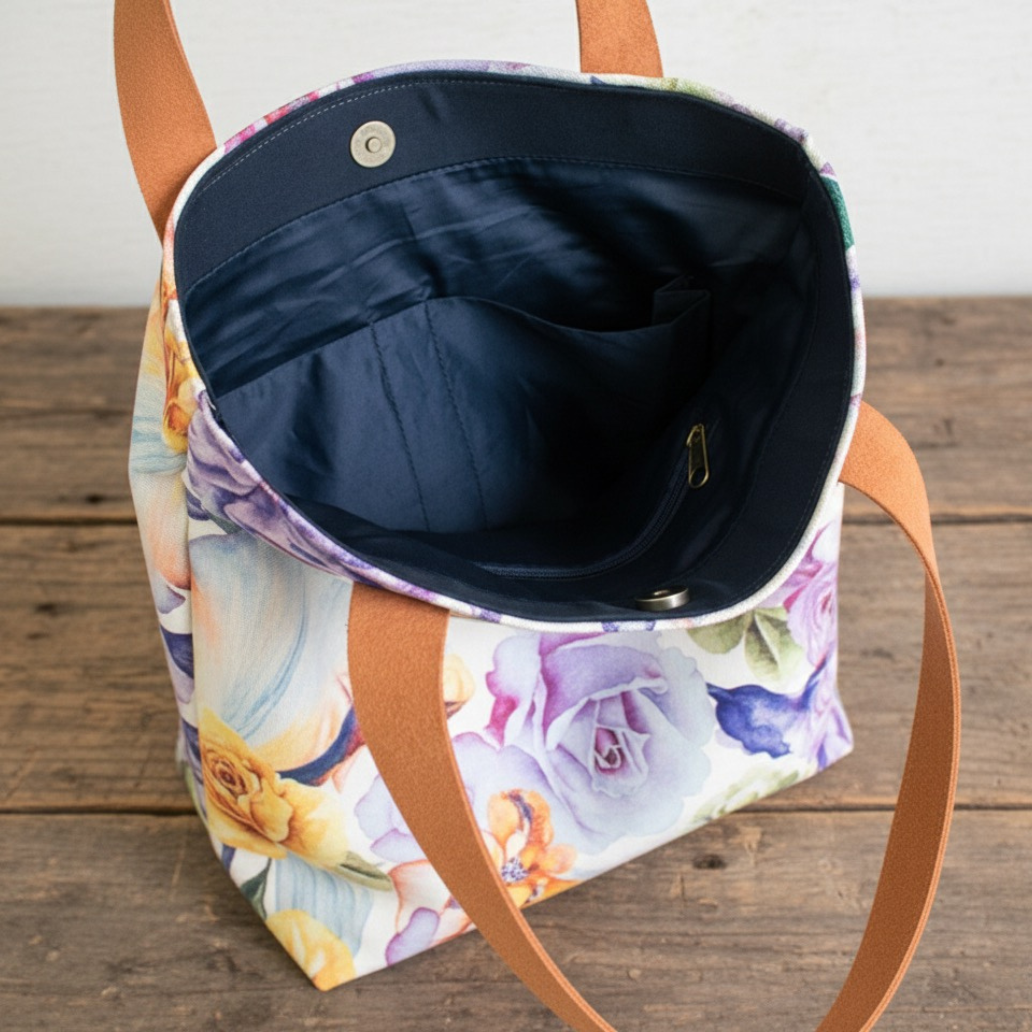 Fully lined interior with navy 100% cotton sateen material. The inside of the bag includes a double slip pocket on one side and a zippered welt pocket on the other side.