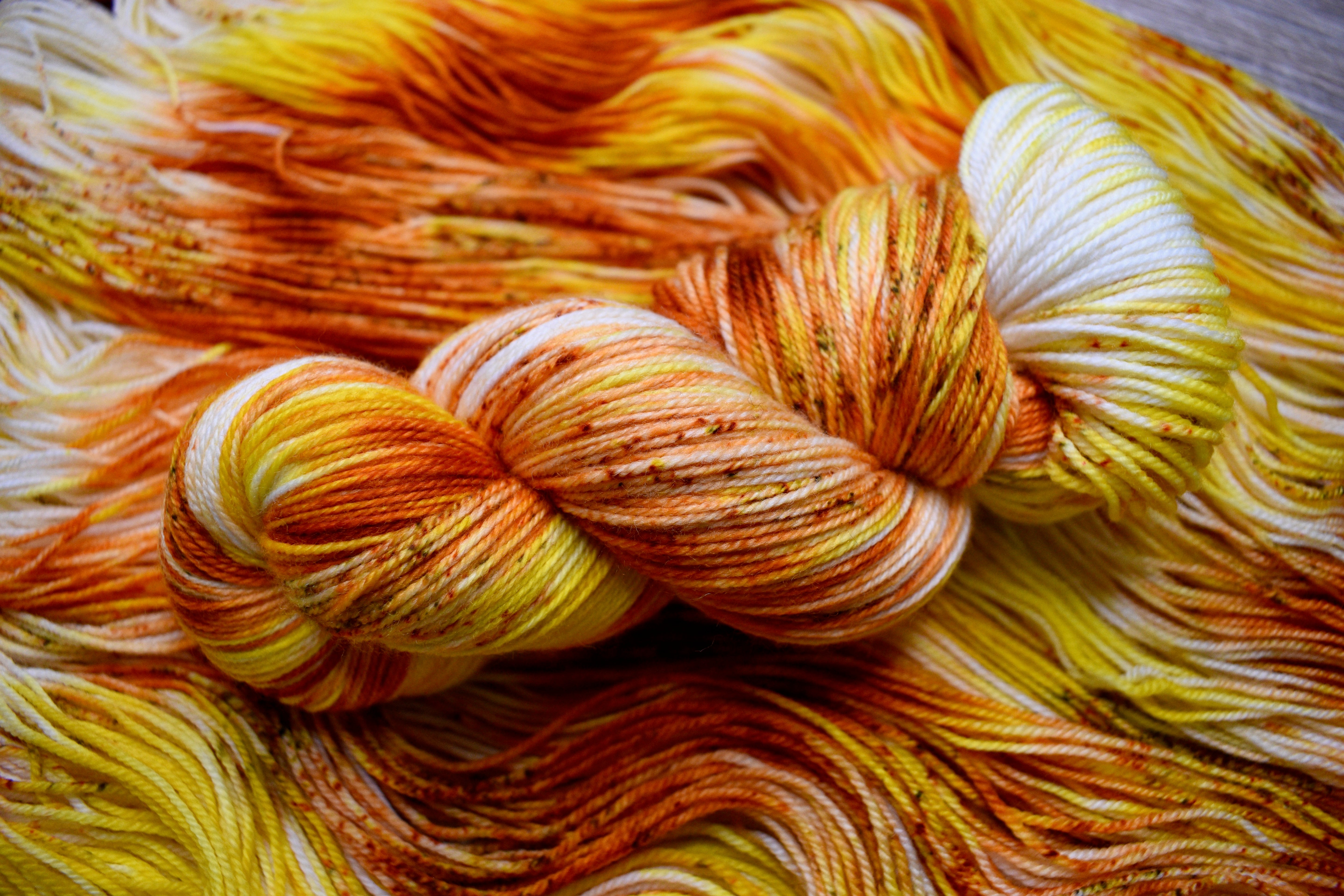 Colour: Saffron - Tonal, semi-solid, speckled, yellow, tobacco, rust, ecru and speckles.
