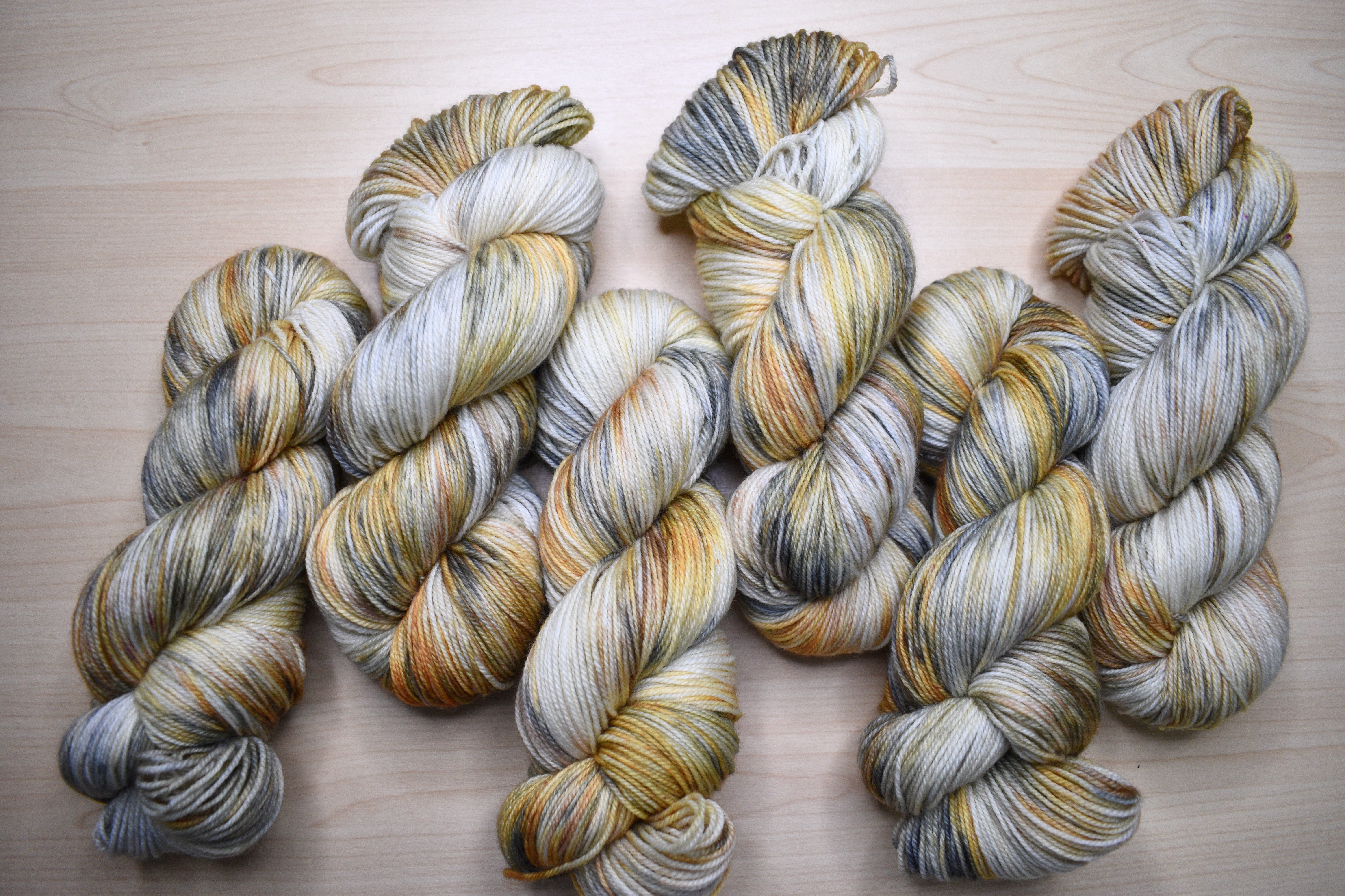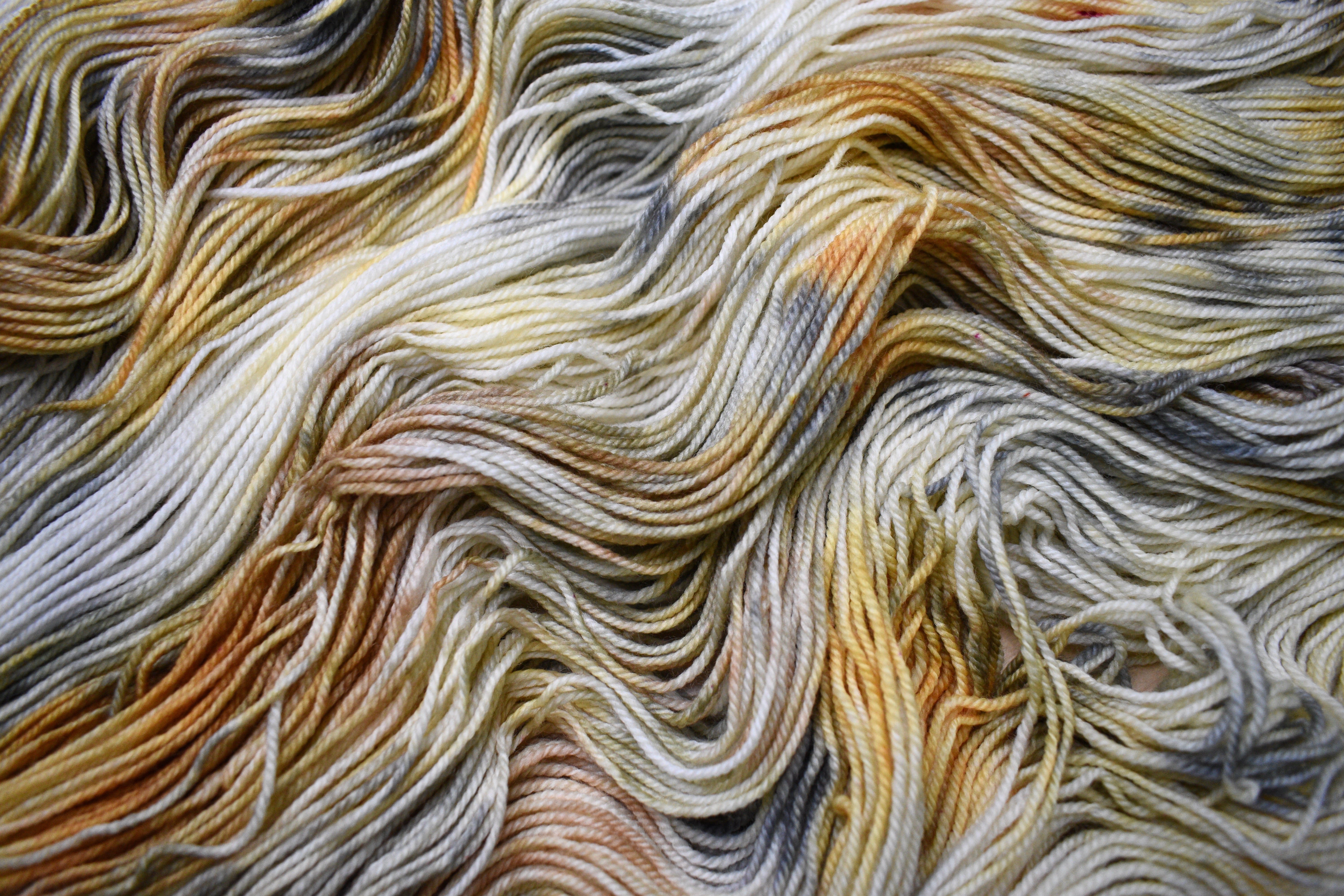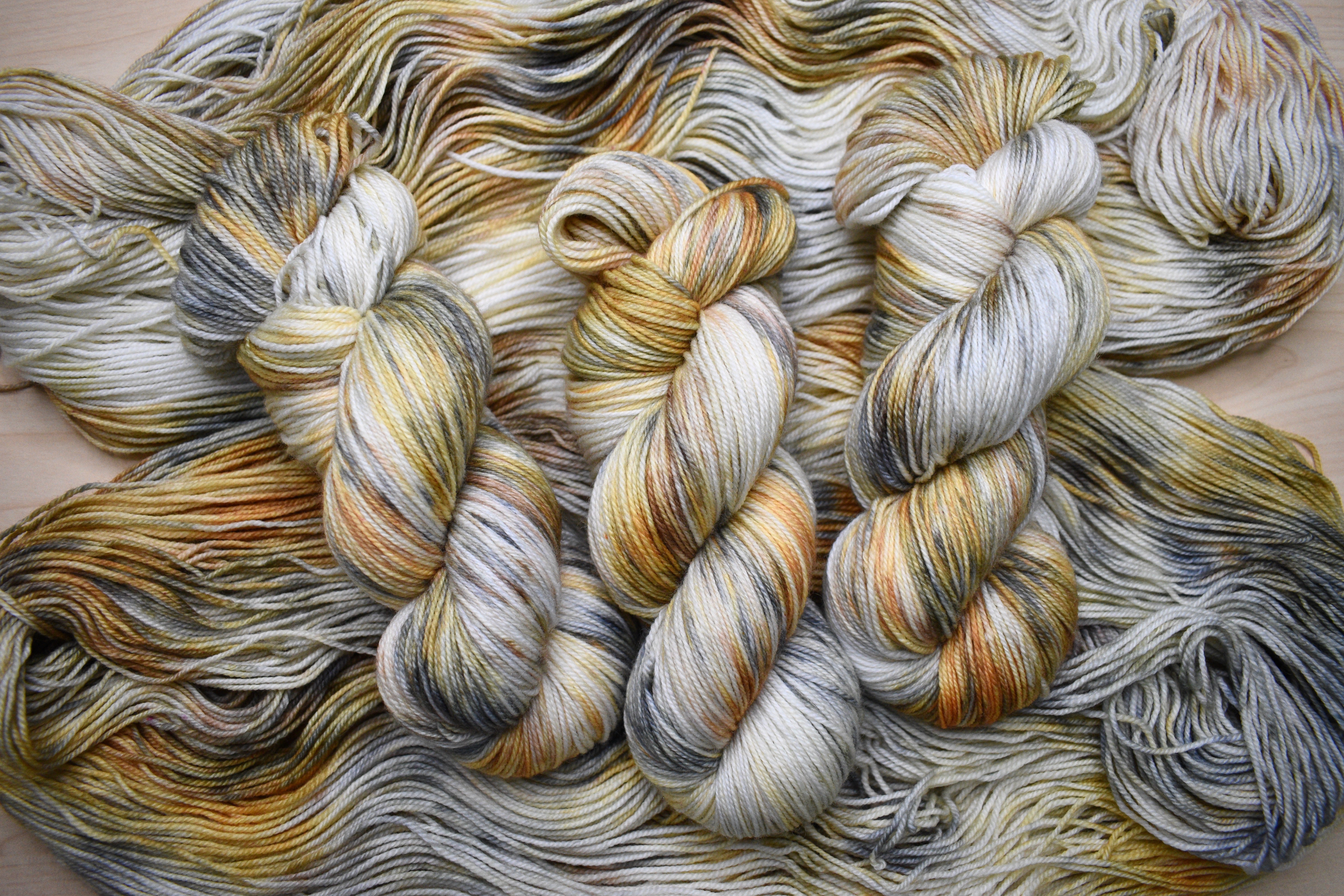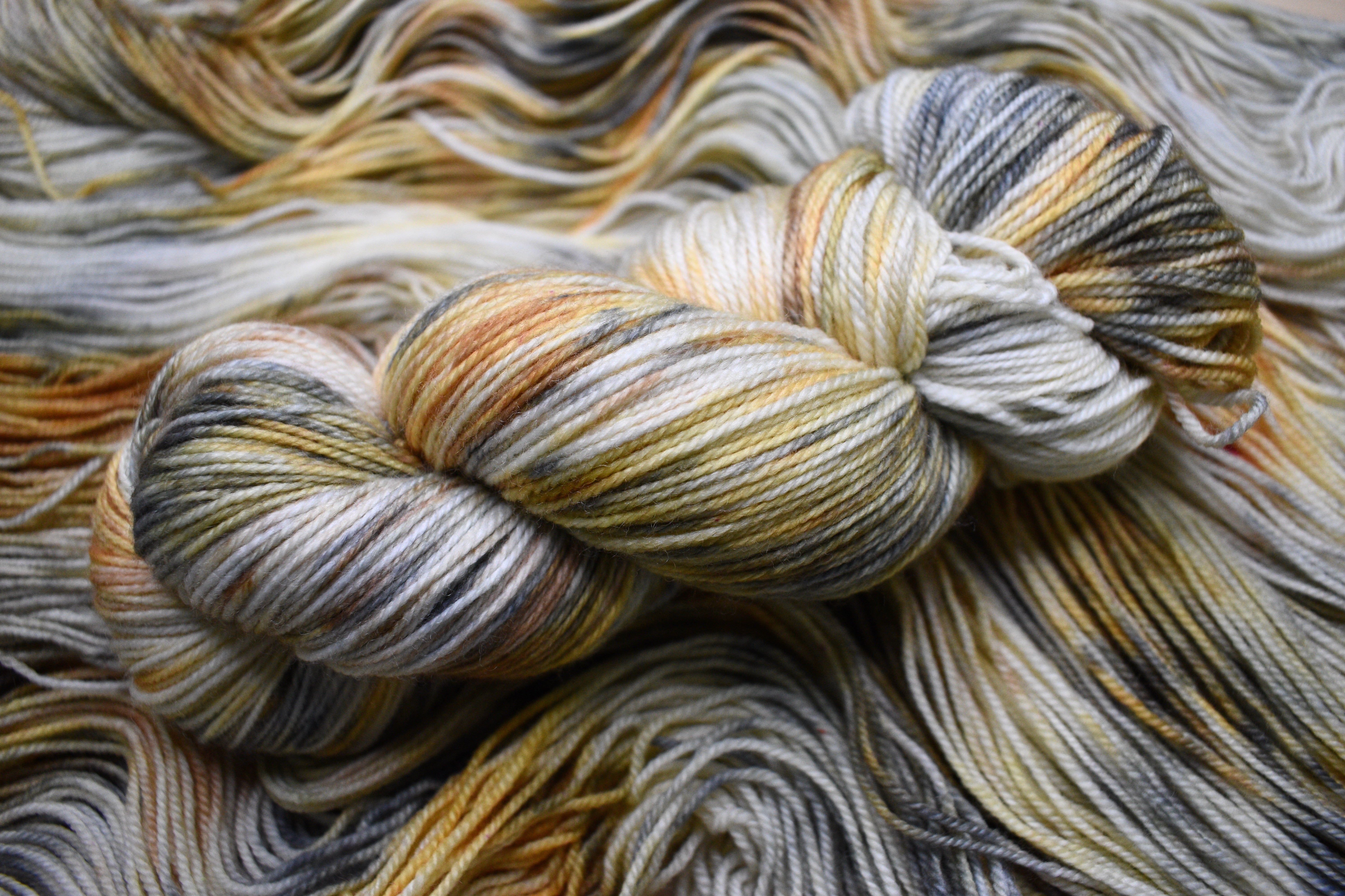 Golden brown hand dyed merino sock yarn.