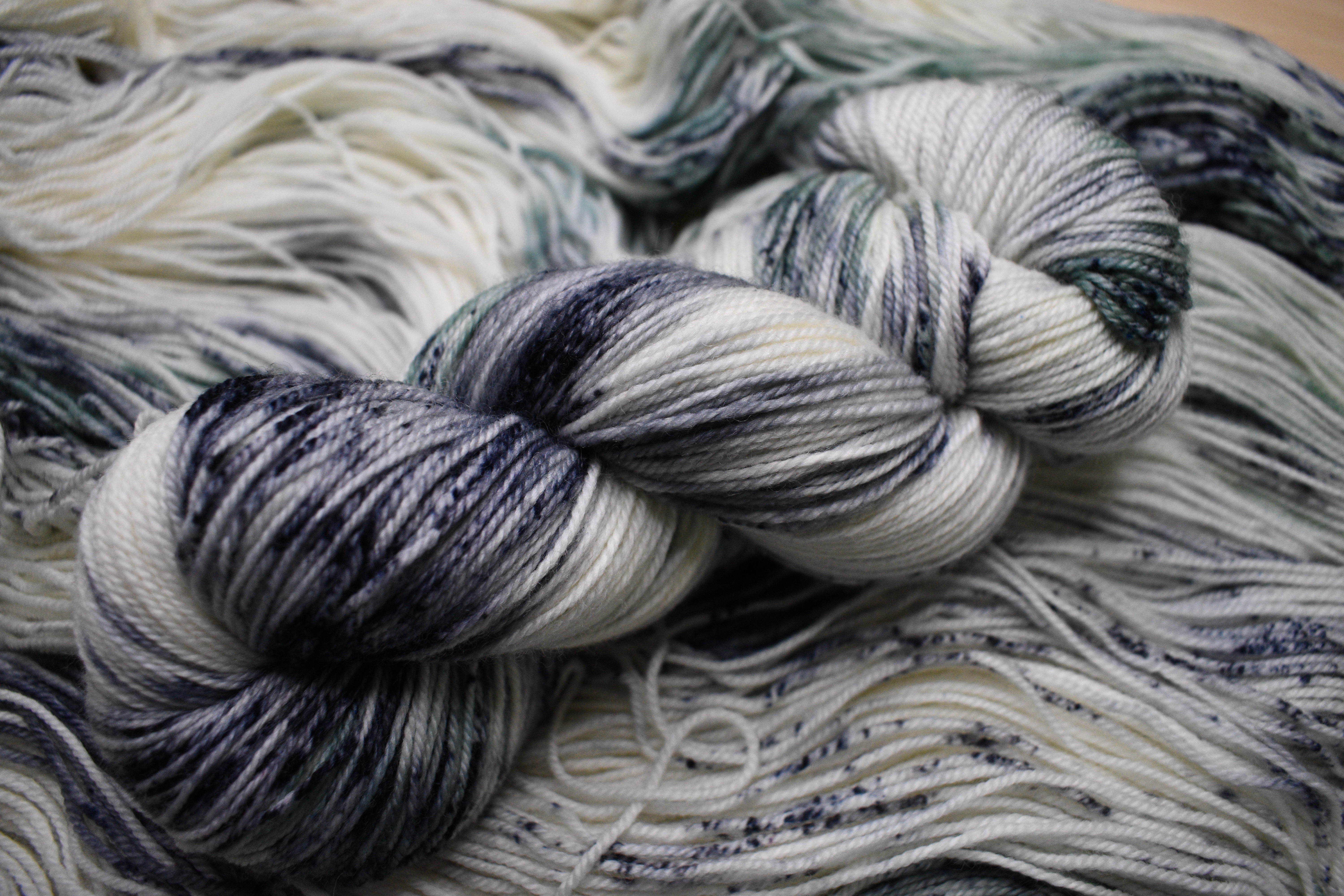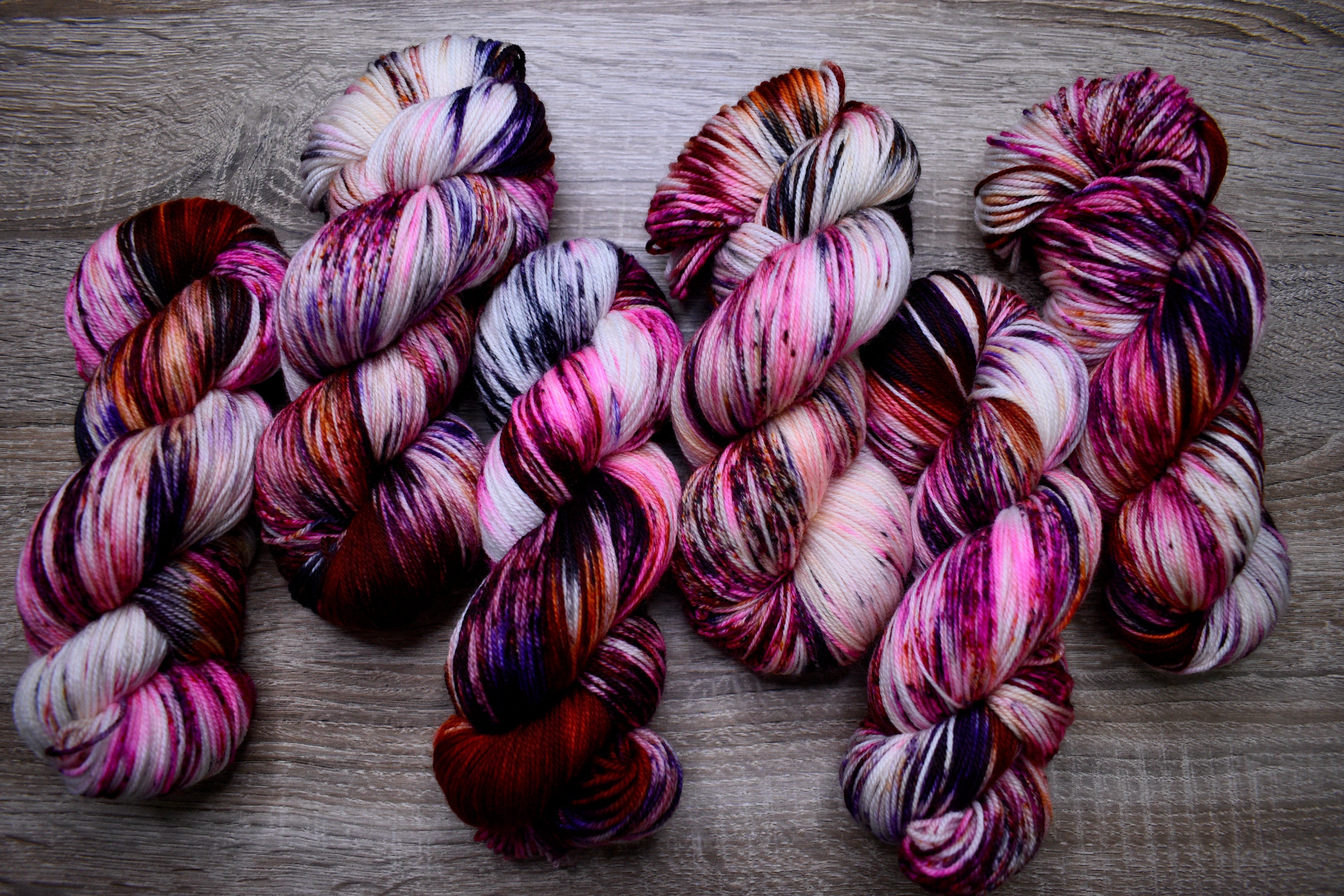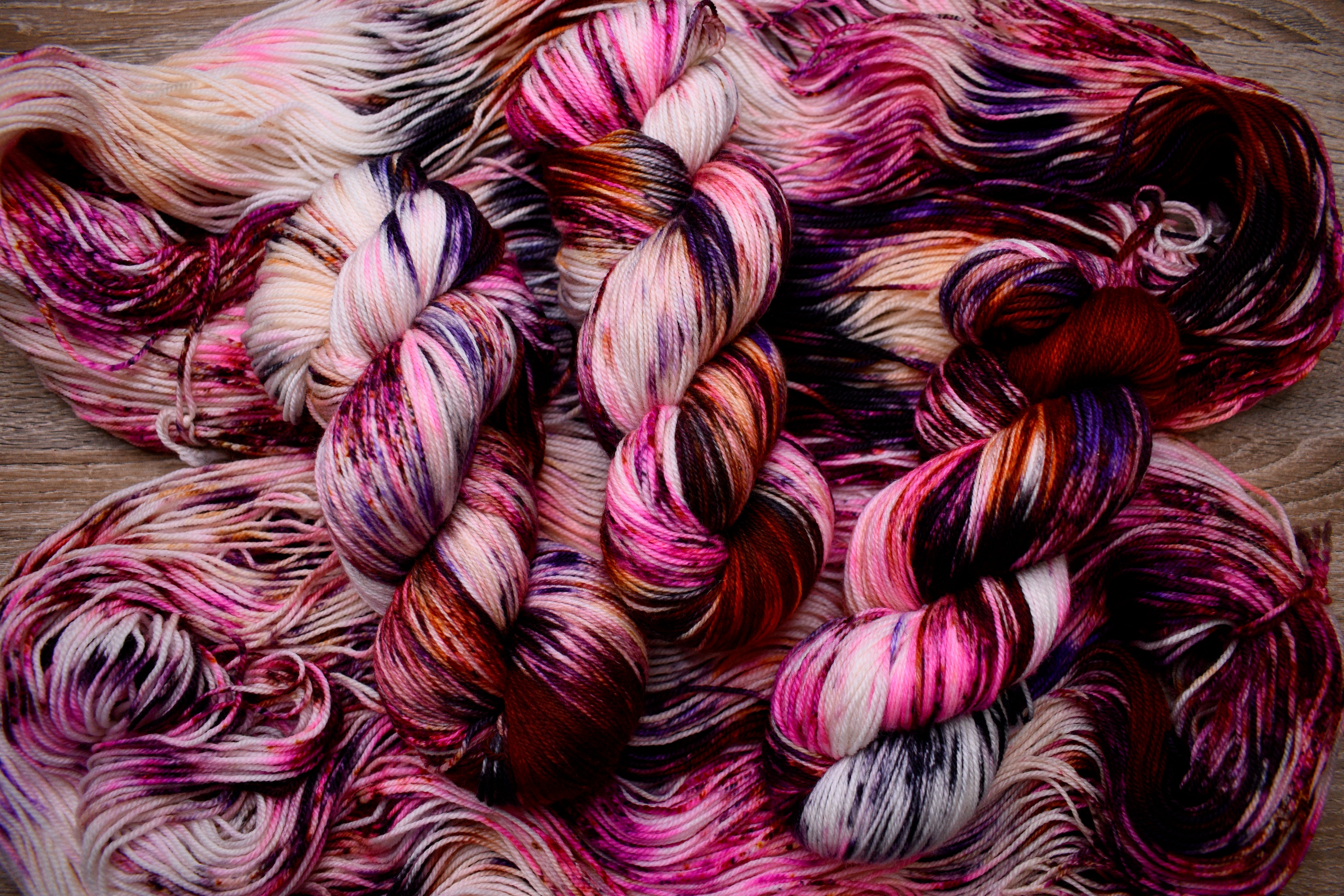 Merino sock yarn in various hand dyed colours.