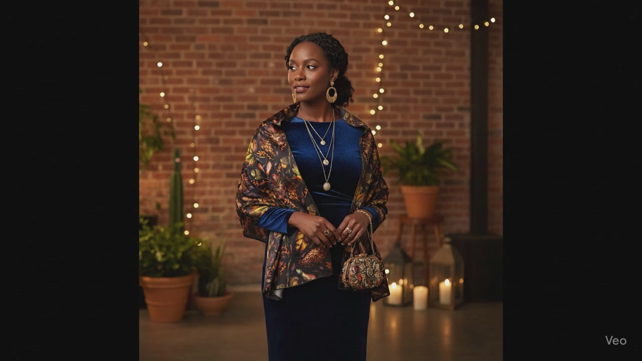 These airy, draped scarves add a splash of fun and creativity to your look. The best part? You can rock them as stylish headbands or twist the ends to make a handy little pouch on the go! Featuring a lively leaf design on a black background for a classic look that captures the spirit of Autumn.