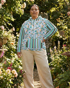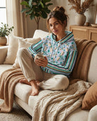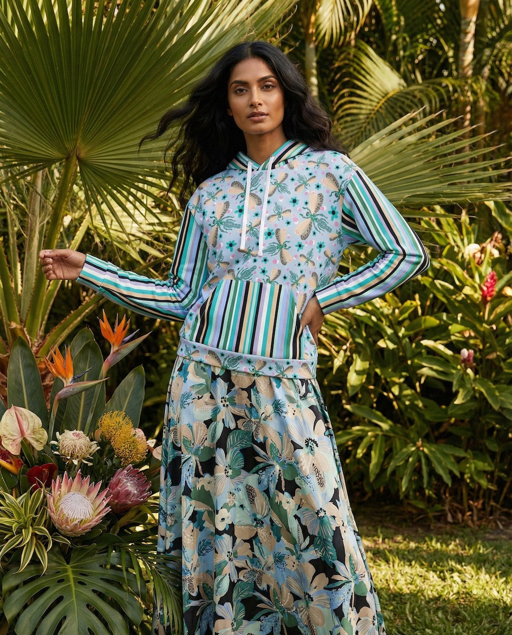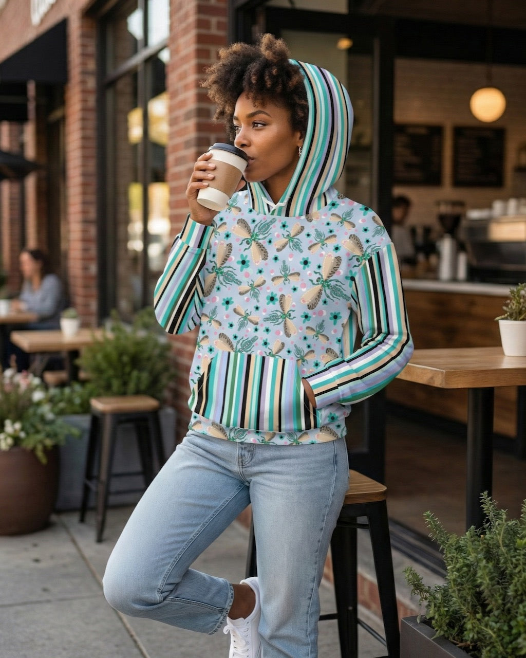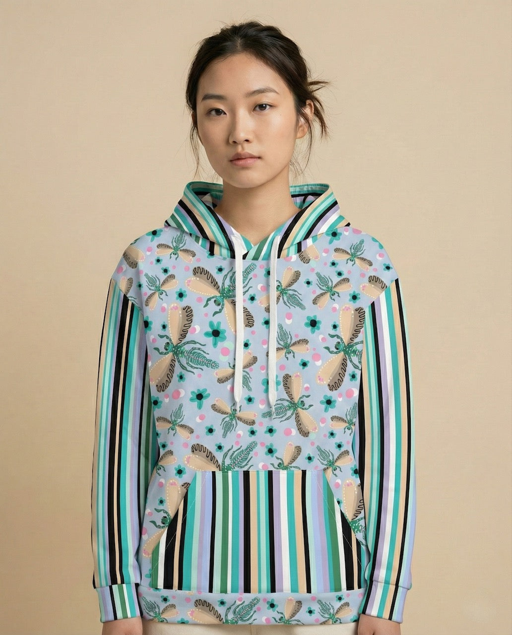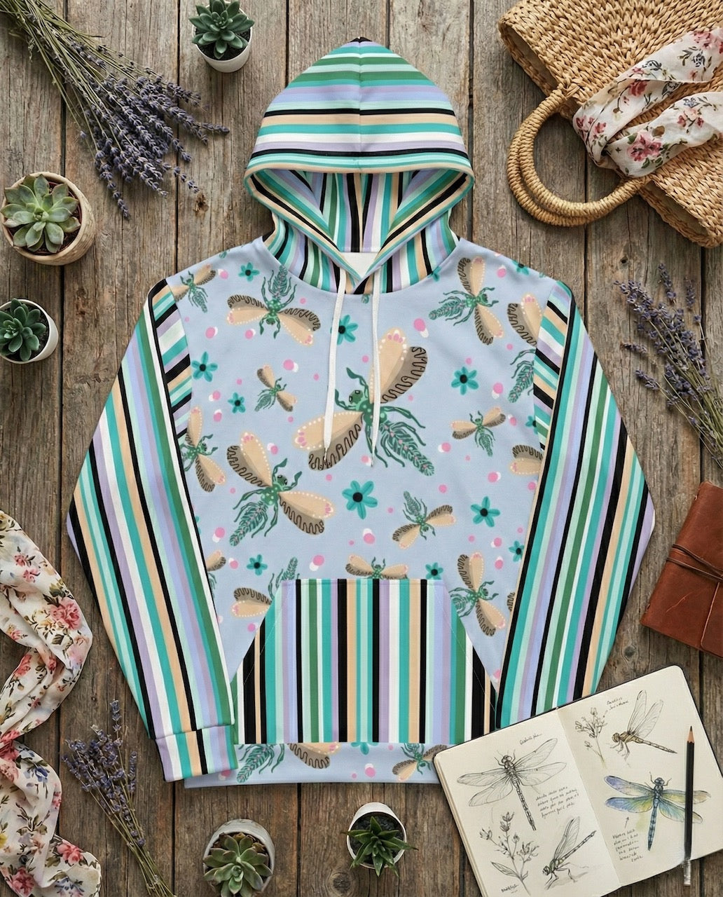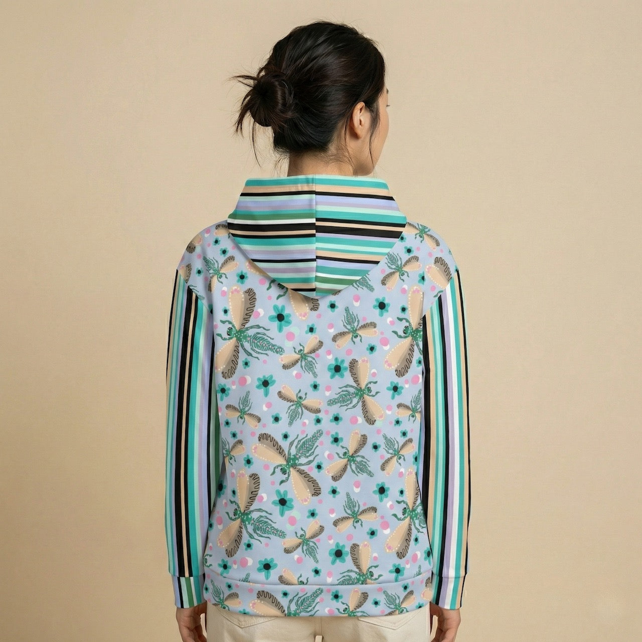 Featuring a whimsical dance of illustrated dragonflies against a soft blue background and paired with bold, retro inspired vertical stripes on the sleeves and pocket, this hoodie embraces playful pattern mixing. It’s a little bit eclectic, a little bit modern art, and 100% cozy.