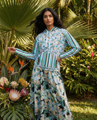 - Collar and cuffs are made from the same patterned fabric of the body for a unified and clean look.