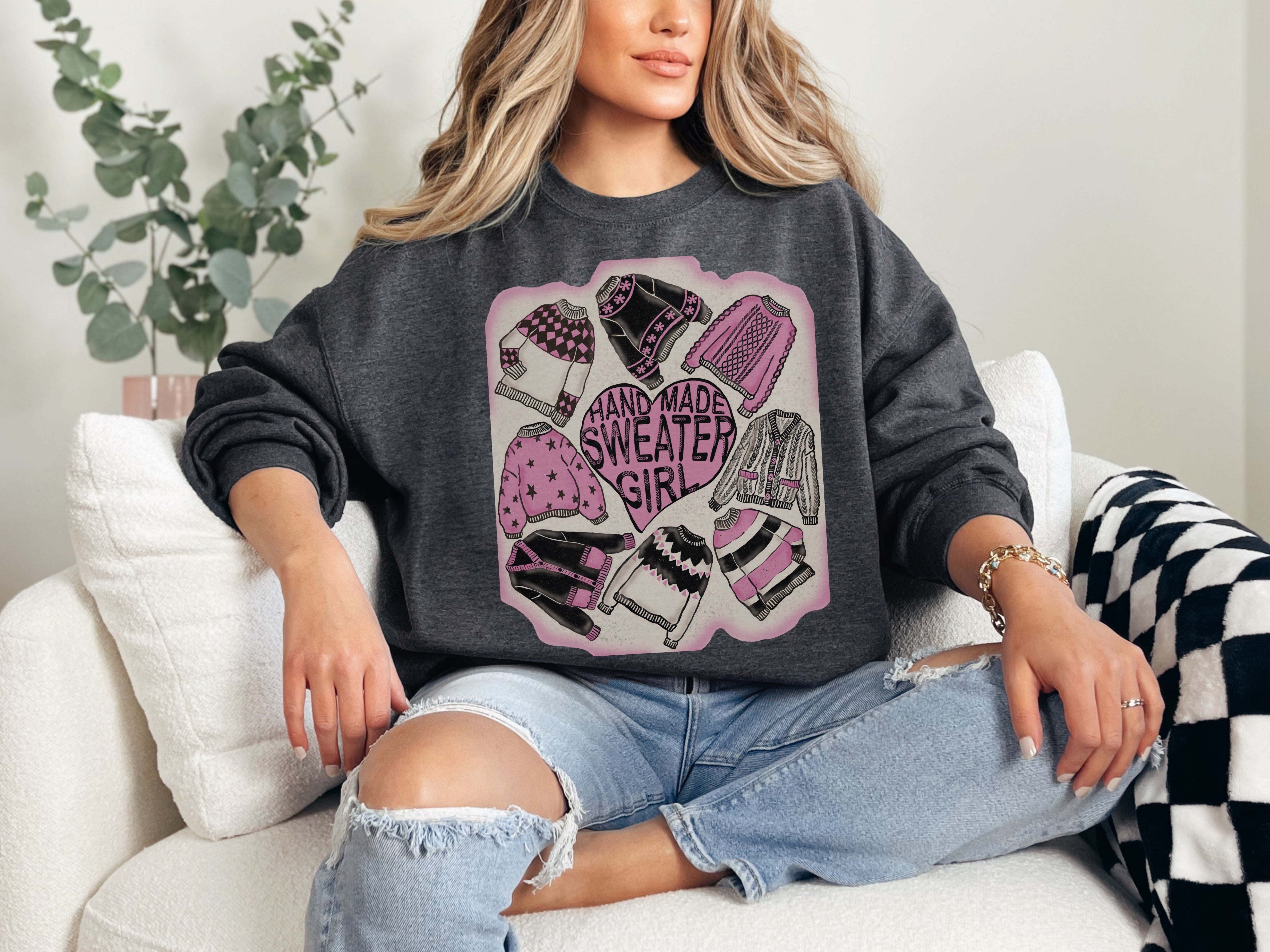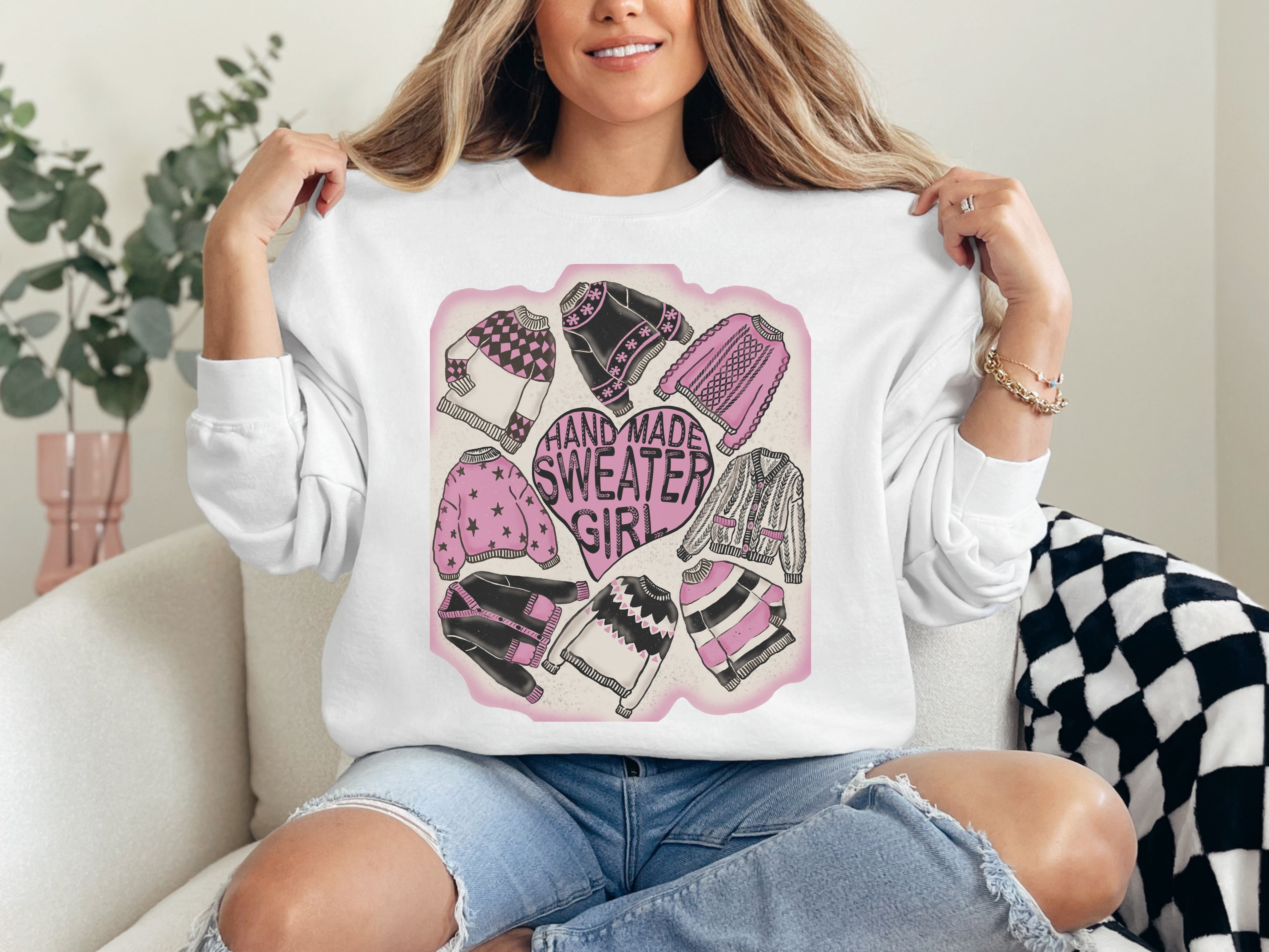 Indulge in the ultimate comfort of a classic sweatshirt while showing off your love for all things handmade with the Sweater Girl Sweatshirt. Not only does it blend coziness and style, but it also features hand drawn illustrations of lovely little sweaters. Stay warm and snuggly while looking cute too!